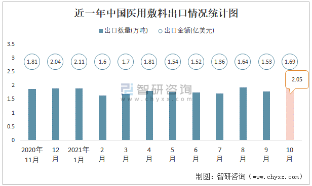 根據(jù)中國海關(guān)數(shù)據(jù)顯示:2021年10月中國醫(yī)用敷料出口數(shù)量為2.05萬噸,同比增長14.3%,出口金額為1.69億美元,同比增長5.9%;2021年1-10月中國醫(yī)用敷料出口數(shù)量為18.02萬噸,出口金額為16.48億美元。