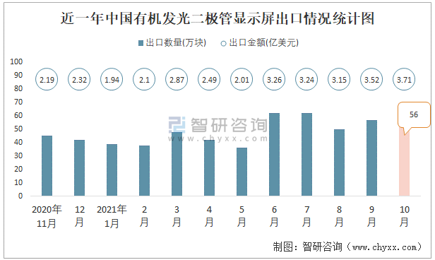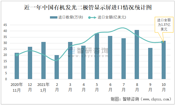 根據中國海關數據顯示:2021年10月中國有機發光二極管顯示屏進口數量為32萬塊,同比增長34.4%,進口金額為1.37億美元,同比增長28.9%,2021年10月中國有機發光二極管顯示屏出口數量為56萬塊,同比增長45.4%,出口金額為3.71億美元,同比增長61.6%;2021年1-10月中國有機發光二極管顯示屏進口數量為305萬塊,進口金額為13.59億美元,出口數量為483萬塊,出口金額為28.08億美元。