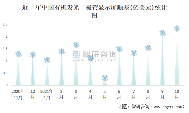 近一年中國有機發光二極管顯示屏順差(億美元)統計圖