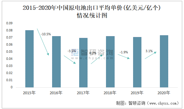 根據(jù)中國(guó)海關(guān)數(shù)據(jù)顯示:2015-2020年中國(guó)原電池出口數(shù)量與出口金額均在2016年跌至最低值,此后總體呈上升趨勢(shì);2015-2020年中國(guó)原電池出口平均單價(jià)2018年增長(zhǎng)速度最快,而2016年中國(guó)原電池出口平均單價(jià)下降速度最快,下滑了10.5%。