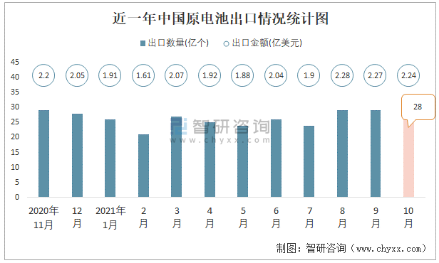 根據(jù)中國(guó)海關(guān)數(shù)據(jù)顯示:2021年10月中國(guó)原電池出口數(shù)量為28億個(gè),同比增長(zhǎng)5.1%,出口金額為2.24億美元,同比增長(zhǎng)9.1%;2021年1-10月中國(guó)原電池出口數(shù)量為260億個(gè),出口金額為20.08億美元。