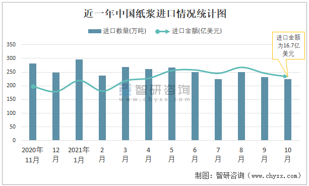根據(jù)中國(guó)海關(guān)數(shù)據(jù)顯示:2021年10月中國(guó)紙漿進(jìn)口數(shù)量為225萬(wàn)噸,同比下降16.4%,進(jìn)口金額為16.7億美元,同比增長(zhǎng)23.4%,2021年1-10月中國(guó)紙漿進(jìn)口數(shù)量為2513萬(wàn)噸,進(jìn)口金額為168.5億美元。