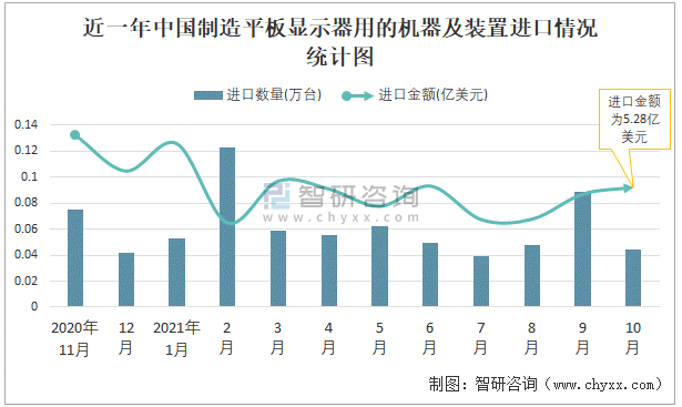 根據(jù)中國海關(guān)數(shù)據(jù)顯示:2021年10月中國制造平板顯示器用的機(jī)器及裝置進(jìn)口數(shù)量為0.04萬臺(tái),同比下降6.9%,進(jìn)口金額為5.28億美元,同比下降17.1%,2021年1-10月中國制造平板顯示器用的機(jī)器及裝置進(jìn)口數(shù)量為0.62萬臺(tái),進(jìn)口金額為49.51億美元。