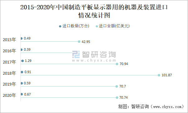 根據(jù)中國海關(guān)數(shù)據(jù)顯示:2015-2020年中國制造平板顯示器用的機(jī)器及裝置進(jìn)口數(shù)量2017年達(dá)到最大值,此后下滑明顯,進(jìn)口金額2018年達(dá)到最高值,此后有所下滑;2015-2020年中國制造平板顯示器用的機(jī)器及裝置進(jìn)口平均單價(jià)2018年增長速度最快,而2017年中國制造平板顯示器用的機(jī)器及裝置進(jìn)口平均單價(jià)下降速度最快,下滑了50%。