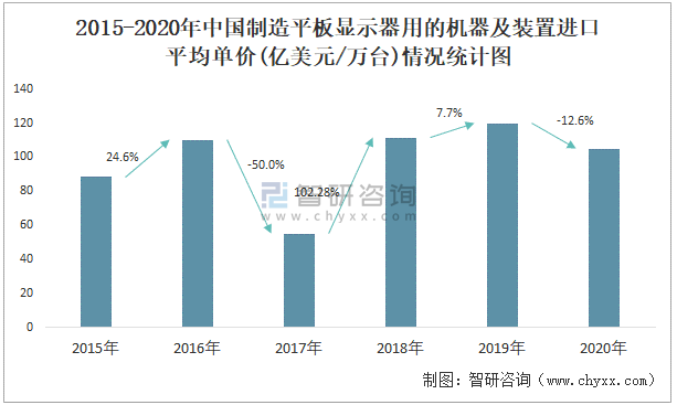 2015-2020年中國制造平板顯示器用的機(jī)器及裝置進(jìn)口平均單價(jià)(億美元/萬臺(tái))情況統(tǒng)計(jì)圖