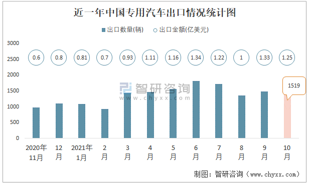 2021年10月中國專用汽車進出口數量分別為6輛和1519輛