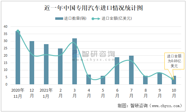 根據中國海關數據顯示:2021年10月中國專用汽車進口數量為6輛,同比下降80%,進口金額為0.03億美元,同比下降73.2%,2021年10月中國專用汽車出口數量為1519輛,同比增長30.6%,出口金額為1.25億美元,同比增長32.7%;2021年1-10月中國專用汽車進口數量為157輛,進口金額為1.12億美元,出口數量為14337輛,出口金額為10.85億美元。