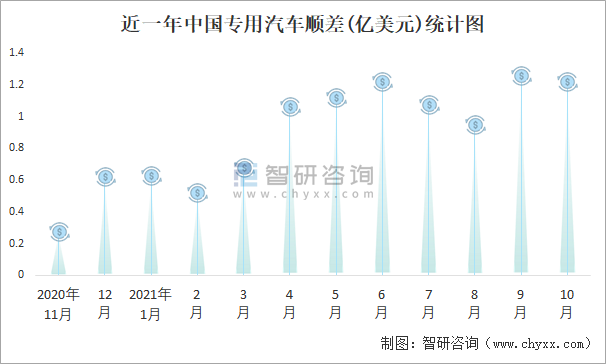 近一年中國專用汽車順差(億美元)統計圖