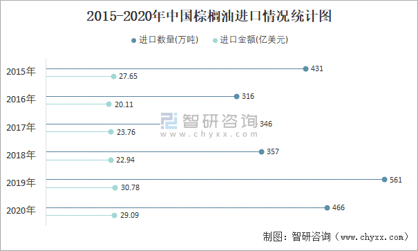 根據中國海關數據顯示:2015-2020年中國棕櫚油進口數量與進口金額均在2019年達到最大值,此后有所下降;2015-2020年中國棕櫚油進口平均單價2020年增長速度最快,而2019年中國棕櫚油進口平均單價下降速度最快,下滑了14.6%。
