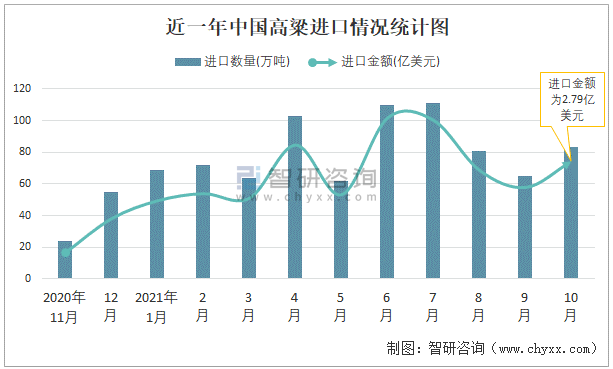 2021年10月中國高粱進(jìn)口數(shù)量和進(jìn)口金額分別為83萬噸和2.79億美元