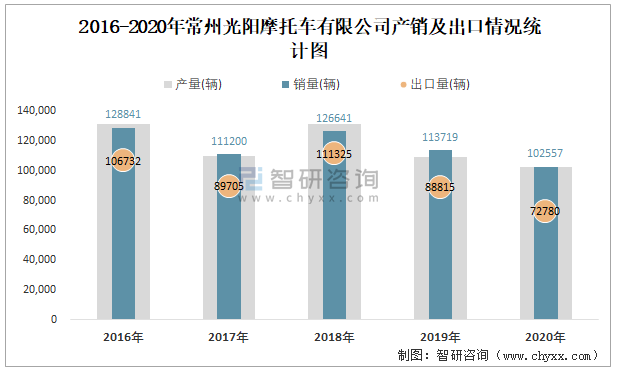 2016-2020年常州光陽摩托車有限公司產銷及出口情況統計圖