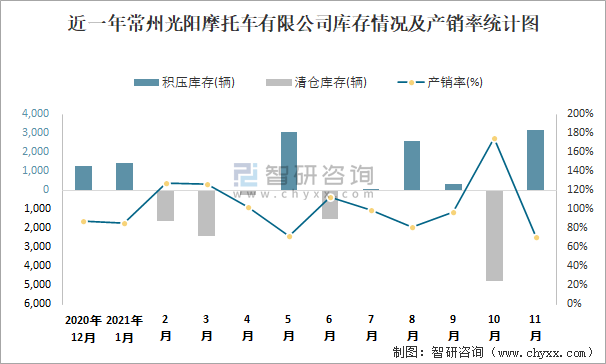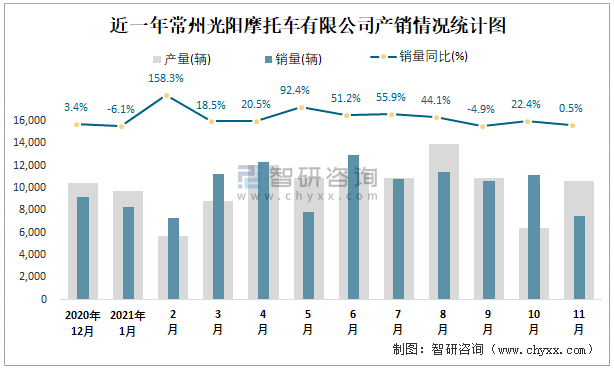 近一年常州光陽摩托車有限公司產銷情況統計圖