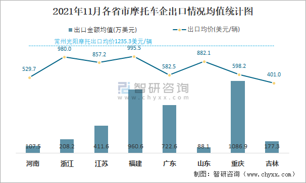 2021年11月各省市摩托車企出口情況均值統計圖
