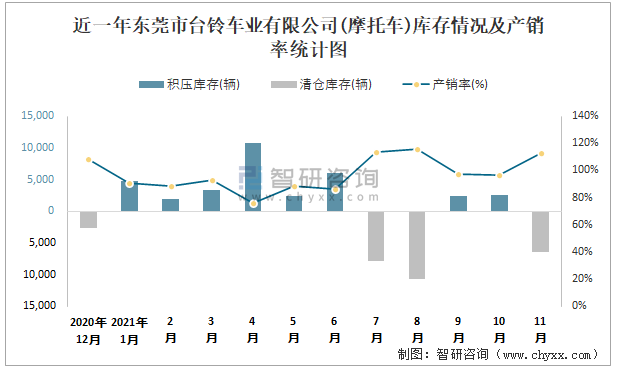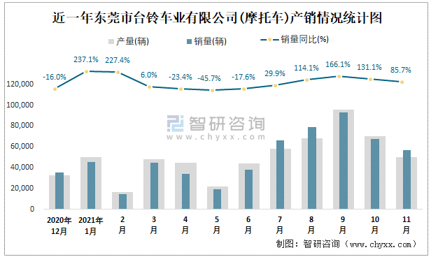 根據(jù)中國汽車工業(yè)(摩托車)產(chǎn)銷快訊數(shù)據(jù)顯示:2021年11月東莞市臺鈴車業(yè)有限公司(摩托車)產(chǎn)量為50402輛,同比增長96.12%,銷量為56795輛,同比增長85.68%;2021年1-11月東莞市臺鈴車業(yè)有限公司(摩托車)累計產(chǎn)量為568342輛,同比增長48.65%,累計銷量為559086輛,同比增長43.69%;2016-2020年東莞市臺鈴車業(yè)有限公司(摩托車)產(chǎn)銷量逐年遞增,且近5年總產(chǎn)量大于總銷量,積壓了庫存2846輛,暫未出口,全部依靠內(nèi)銷。