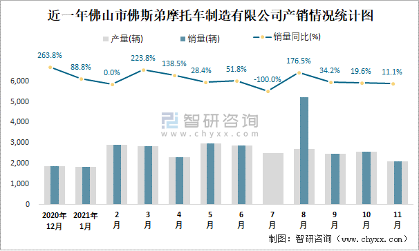 近一年佛山市佛斯弟摩托車制造有限公司產(chǎn)銷情況統(tǒng)計圖