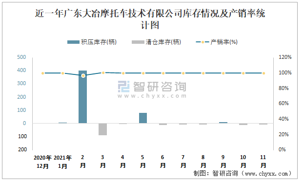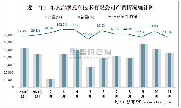 近一年廣東大冶摩托車技術有限公司產銷情況統計圖