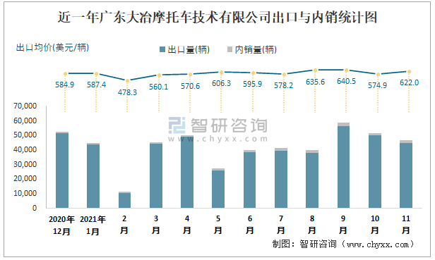 根據中國汽車工業(摩托車)產銷快訊數據統計可知:近一年廣東大冶摩托車技術有限公司(摩托車)共積壓庫存367輛,其產銷率存在一定幅度波動,3月產銷率最高(100.2%),清倉庫存89輛,2月產銷率偏低(96.57%),積壓庫存400輛;近一年廣東大冶摩托車技術有限公司(摩托車)總體銷量以出口為主,總出口量占比總銷量的96.8%,出口均價9月達到最高值,次月有所下滑,其中11月出口量為44962輛,出口均價約為622美元/輛;2021年1-11月廣東大冶摩托車技術有限公司(摩托車)累計出口量為441605輛,同比增長54.95%,累計出口金額約為26241.58萬美元,同比增長71.83%。