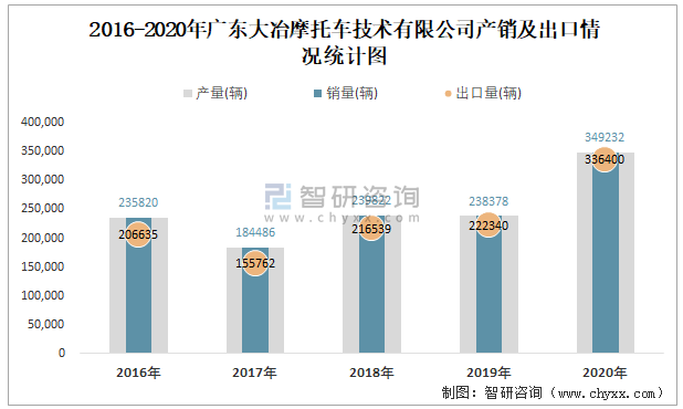 2016-2020年廣東大冶摩托車技術有限公司產銷及出口情況統計圖