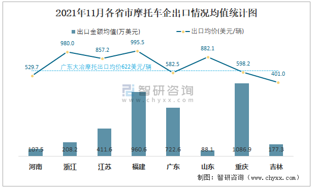 2021年11月各省市摩托車企出口情況均值統計圖