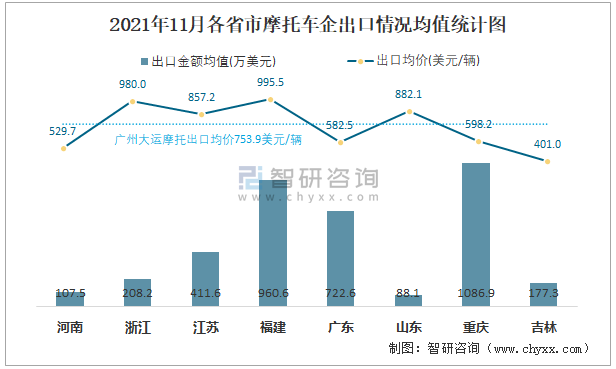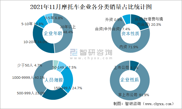根據中國汽車工業(摩托車)產銷快訊與企查查數據統計可知:2021年11月92家車企摩托車銷量為1657429輛,出口總金額約為50967.89萬美元(其中有兩家子公司,其數據已包含在母公司中,不參加行業匯總);2021年11月92家車企擁有20年以上企業年齡的銷量最高,從企業資本性質來看,銷量占比最大的為內資企業(部分上市公司股份不明確的企業未統計在內),從企業人員規模來看,擁有1000-9999人員規模的車企銷量占比最大,非上市公司銷量占比最高。92家車企主要分布在10個省(市),其中廣東車企最多(26個),部分省市車企不出口,從出口金額均值來看,重慶車企(18家企業)出口金額均值最高,廣州大運摩托車有限公司約為753.9美元/輛,高于廣東出口均價。