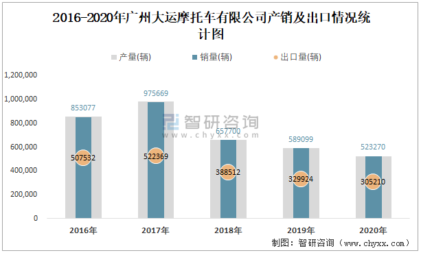 2016-2020年廣州大運摩托車有限公司產銷及出口情況統計圖