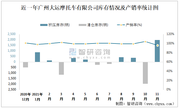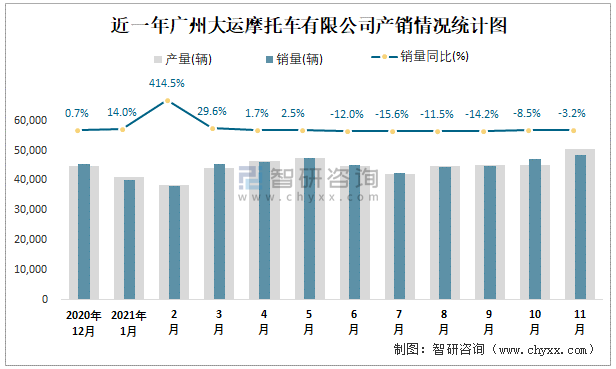 近一年廣州大運摩托車有限公司產銷情況統計圖