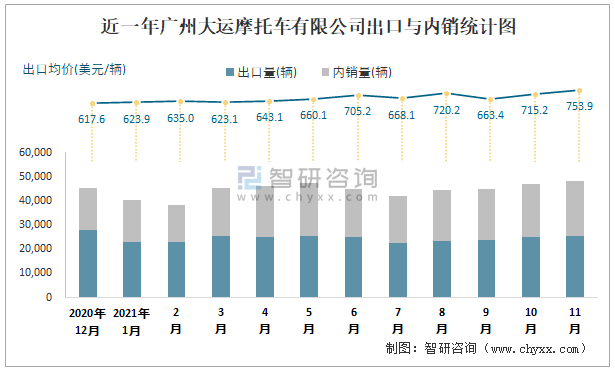 根據中國汽車工業(摩托車)產銷快訊數據統計可知:近一年廣州大運摩托車有限公司(摩托車)共積壓庫存279輛,其產銷率存在一定幅度波動,10月產銷率最高(104.36%),清倉庫存1972輛,11月產銷率偏低(96.07%),積壓庫存1979輛;近一年廣州大運摩托車有限公司(摩托車)總體銷量以出口為主,總出口量占比總銷量的55.2%,出口均價9月起逐月遞增,其中11月出口量為25422輛,出口均價約為753.89美元/輛;2021年1-11月廣州大運摩托車有限公司(摩托車)累計出口量為267367輛,同比下降3.55%,累計出口金額約為18028.41萬美元,同比增長4%。