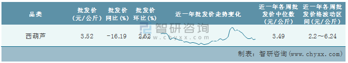 根據(jù)農(nóng)村農(nóng)業(yè)部數(shù)據(jù)統(tǒng)計可知:2022年第2周全國西葫蘆平均批發(fā)價為3.52元/公斤,同比下跌16.19%,環(huán)比增加2.62%,近一年全國西葫蘆平均批發(fā)價最高達到6.24元/公斤,2021年下半年達到高峰值,批發(fā)價最低為2.2元/公斤。