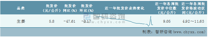 2022年第2周(2022年1月3日-1月9日)全國生姜平均批發價分析:本周批發價為5.8元/公斤,同比下跌47.61%