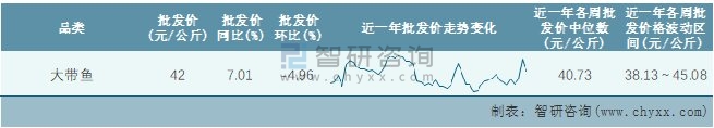 根據農村農業部數據統計可知:2022年第2周全國大帶魚平均批發價為42元/公斤,同比增加7.01%,環比下跌4.96%,近一年全國大帶魚平均批發價最高達到45.08元/公斤,批發價最低也要38.13元/公斤。