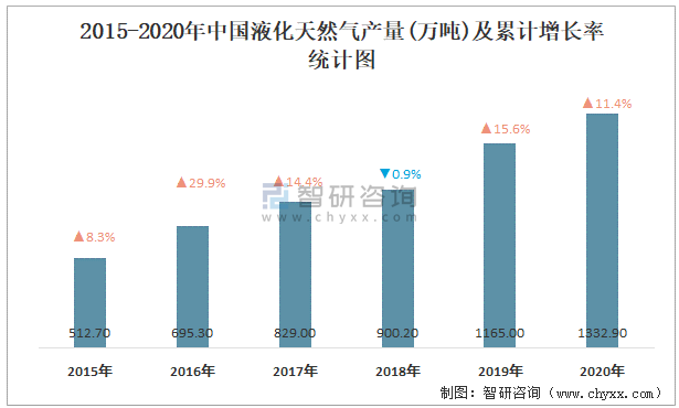 2015-2020年中國液化天然氣產量及累計增長率統計圖