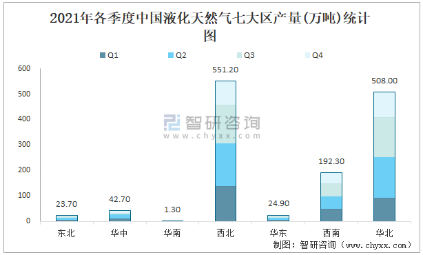 2021年各季度中國液化天然氣七大區產量統計圖