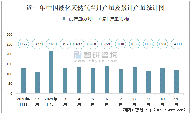 根據國家統計局數據顯示:2021年11月中國液化天然氣產量為123萬噸,同比下降13.1%;2021年1-11月中國液化天然氣累計產量為1410.8萬噸,累計增長9.2%;2015-2020年中國液化天然氣產量逐年遞增,2020年達到最高。