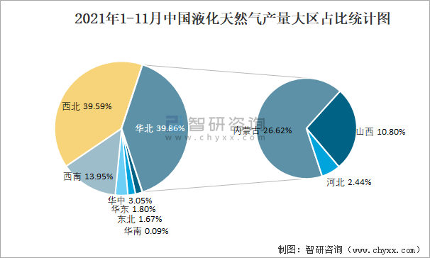 2021年1-11月中國液化天然氣產量大區占比統計圖