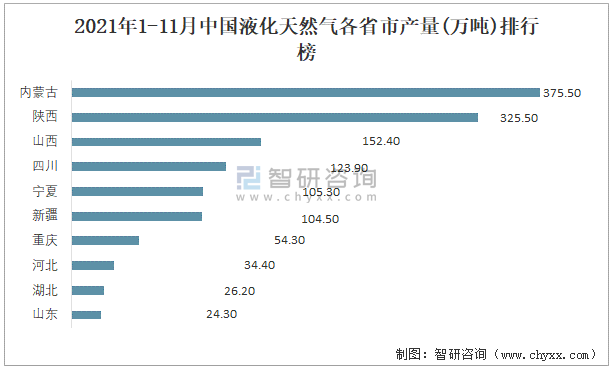 2021年1-11月中國液化天然氣各省市產量排行榜