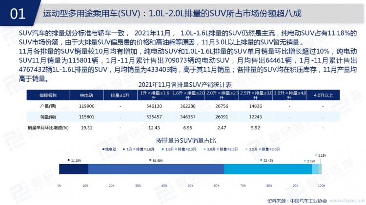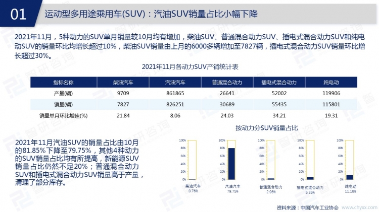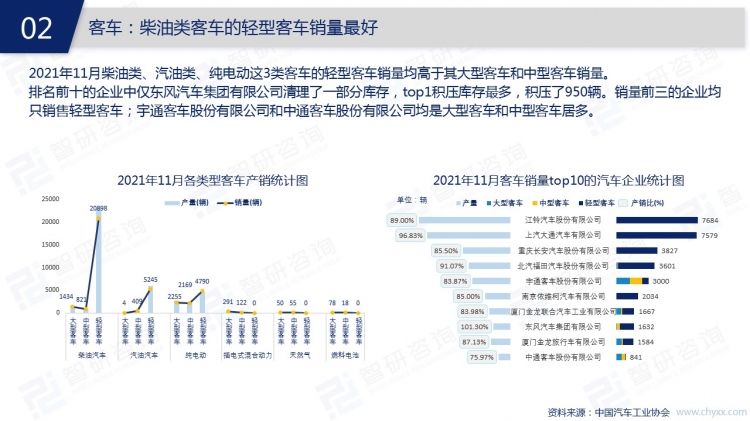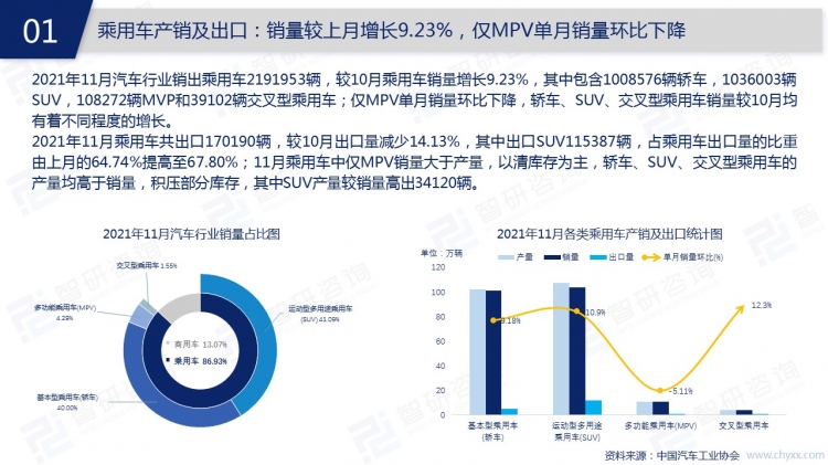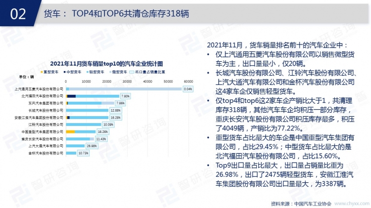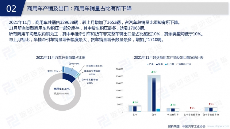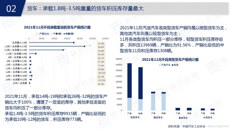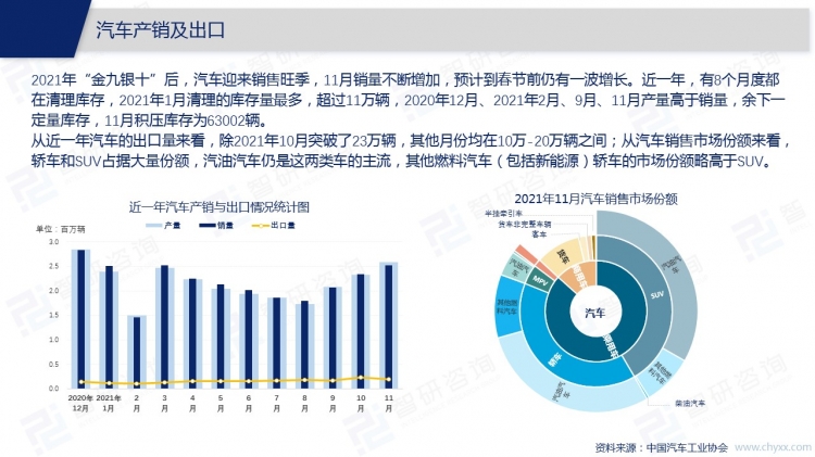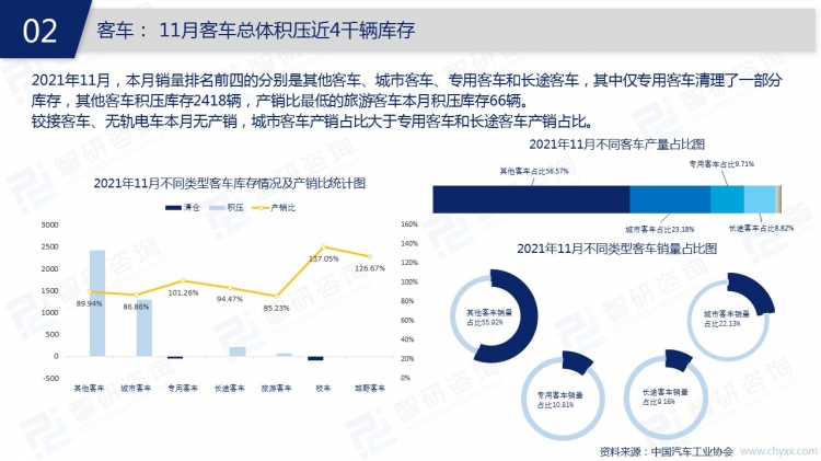 2021年11月,中國汽車市場處于旺季,銷量持續(xù)增加,中國人素有“開車回家過年”的情結,消費者的購車需求增加,年前汽車銷售市場或將迎來高峰。為給年前的消費高峰做好儲備,大多數汽車企業(yè)11月增加了產量,轎車、SUV、交叉型乘用車、客車、貨車、半掛牽引車等類型汽車11月均有庫存積壓,共計63002輛。