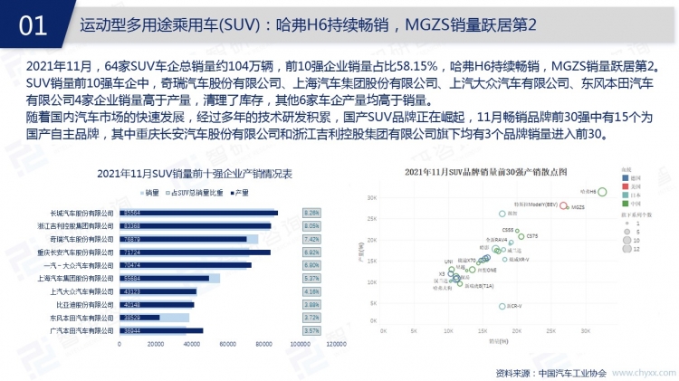 11月,SUV汽車品牌領域殺出一匹黑馬,上海股份旗下國產品牌MGZS戰(zhàn)勝特斯拉ModelY(BEV),以超出其624輛的銷量躍居于第二,僅次于哈弗H6。縱觀其突圍史,MGZS于2017年3月4日正式上市,幾年沉浮,2021年11月銷量第一次突破2萬輛大關,其號稱首款互聯網概念小型SUV,官方售價為7.98-11.28萬元,高性價比或許是本次突圍成功的重大原因之一。其他國產品牌在SUV領域也有著不俗的表現,但其高端市場鮮少有暢銷的國產品牌身影,中國汽車品牌仍有很長的路要走。