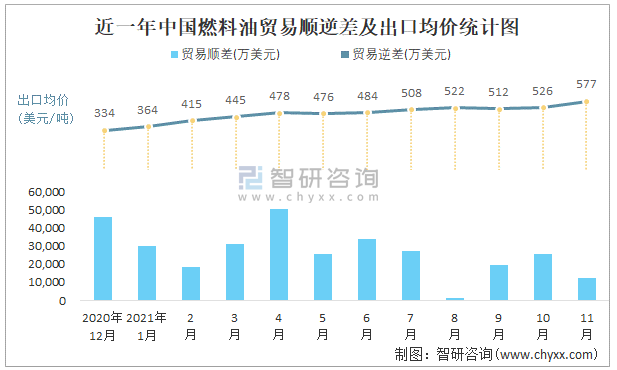 近一年中國燃料油順逆差及出口均價統(tǒng)計圖