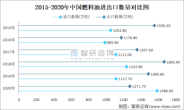 2015-2020年中國燃料油進出口數(shù)量對比統(tǒng)計圖