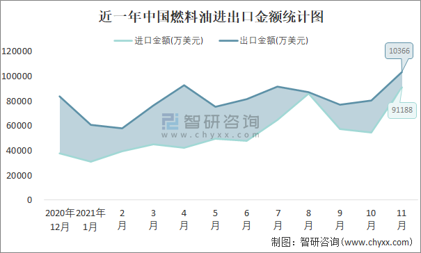 近一年中國燃料油進出口金額統(tǒng)計圖