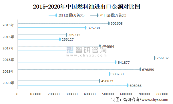 2015-2020年中國燃料油進出口金額對比統(tǒng)計圖