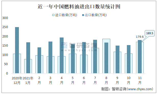 近一年中國燃料油進出口數(shù)量統(tǒng)計圖