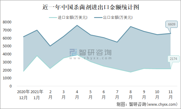 根據中國石油和化學工業聯合會數據顯示:2021年11月中國殺菌劑進口數量為0.2萬噸,出口數量為1.1萬噸;進口金額為2174萬美元,出口金額為6609萬美元;近一年中國殺菌劑出口總金額大于進口總金額,貿易順差為主,出口均價6008美元/噸。