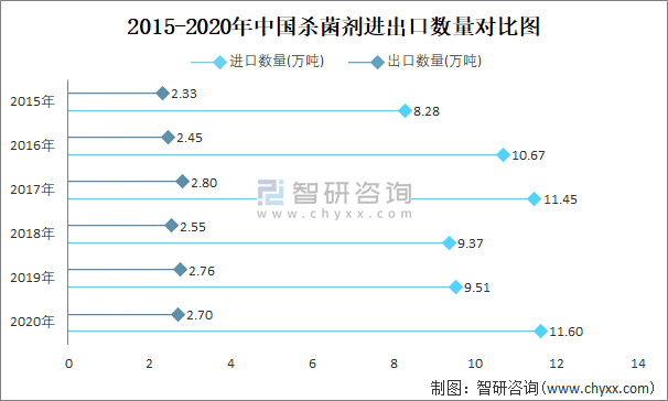 2015-2020年中國殺菌劑進出口數量對比統計圖