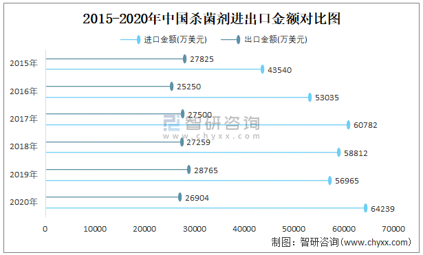 2015-2020年中國殺菌劑進出口金額對比統計圖