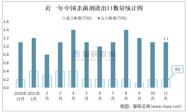2021年11月中國殺菌劑進出口數量分別為0.2萬噸和1.1萬噸