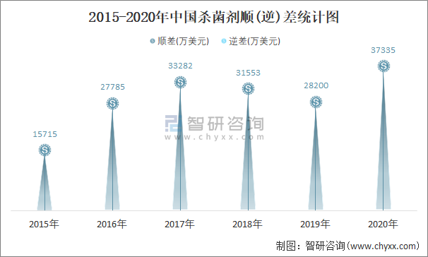 2015-2020年中國殺菌劑順(逆)差統計圖