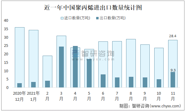 近一年中國聚丙烯進出口數(shù)量統(tǒng)計圖