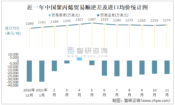 近一年中國聚丙烯順逆差及進口均價統(tǒng)計圖