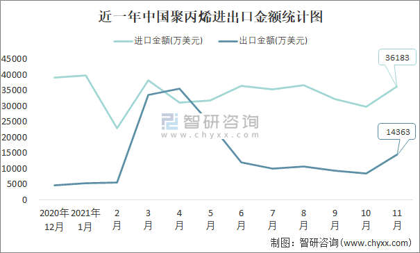 近一年中國聚丙烯進出口金額統(tǒng)計圖
